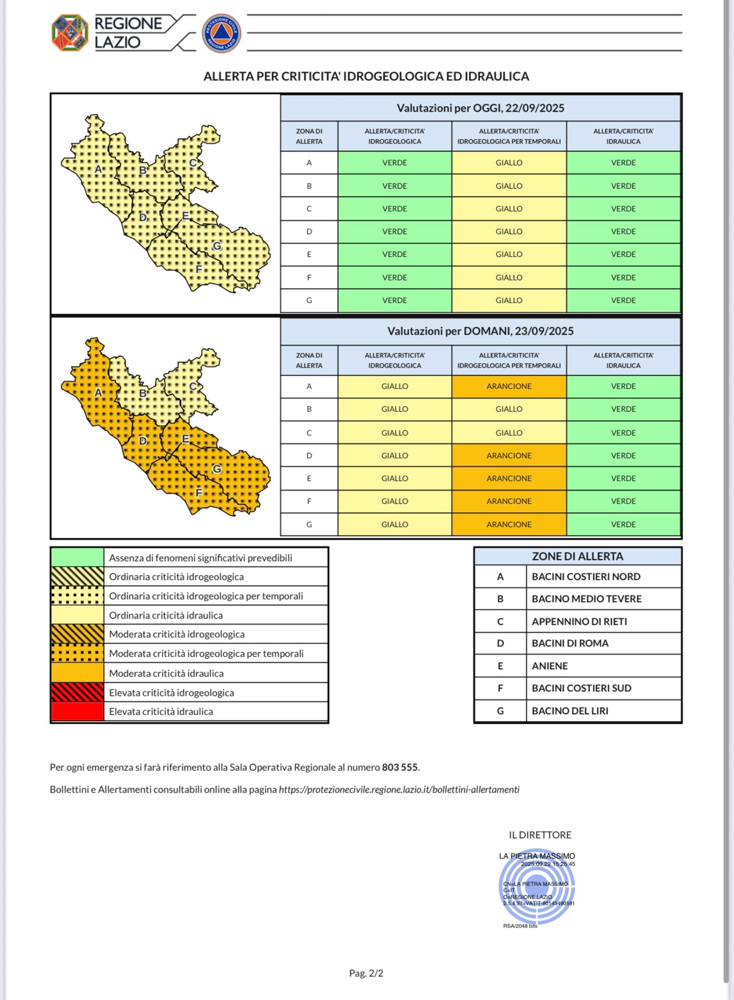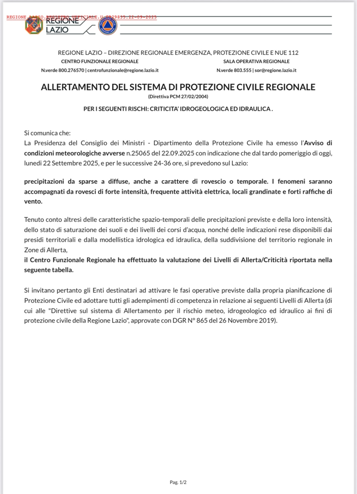 Allarme: Un evento calamitoso, con possibili conseguenze per la pubblica incolumità e per il territorio, è in fase di sviluppo sul territorio regionale (od una sua parte) ed è costantemente monitorato dalla Protezione Civile della Regione, che opera sul territorio con azioni di tutela della popolazione e riduzione del rischio.